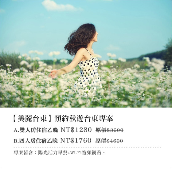 只要1,280元起即可享有【美麗台東】原價最高4,600元預約秋遊台東專案:(A)雙人房住宿乙晚/(B)四人房住宿乙晚,專案皆含:陽光活力早餐+Wi-Fi寬頻網路?